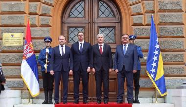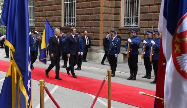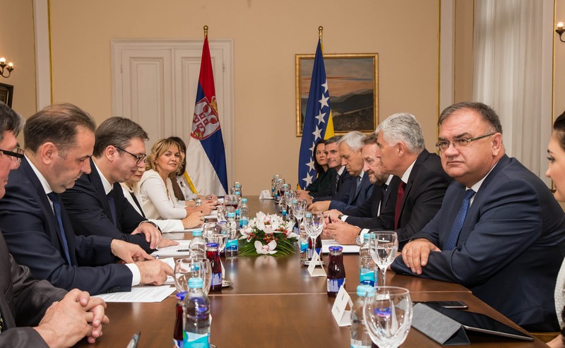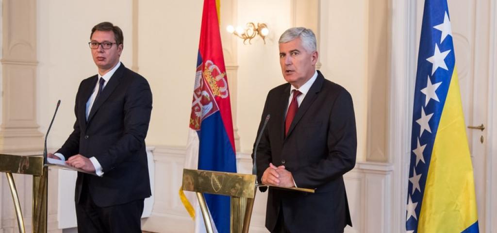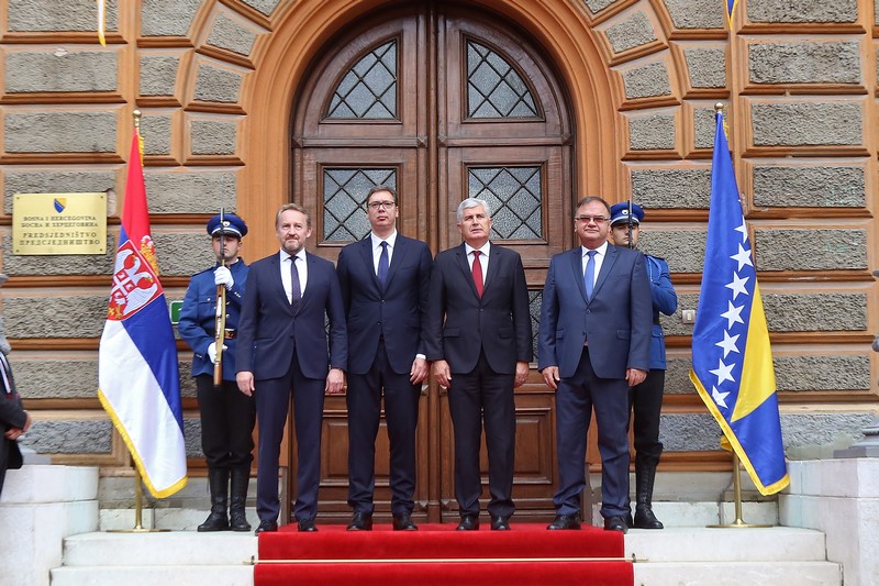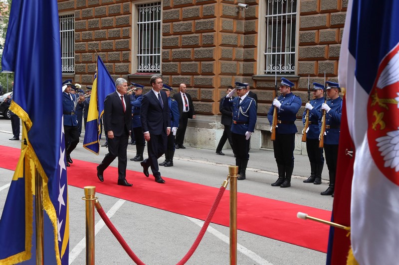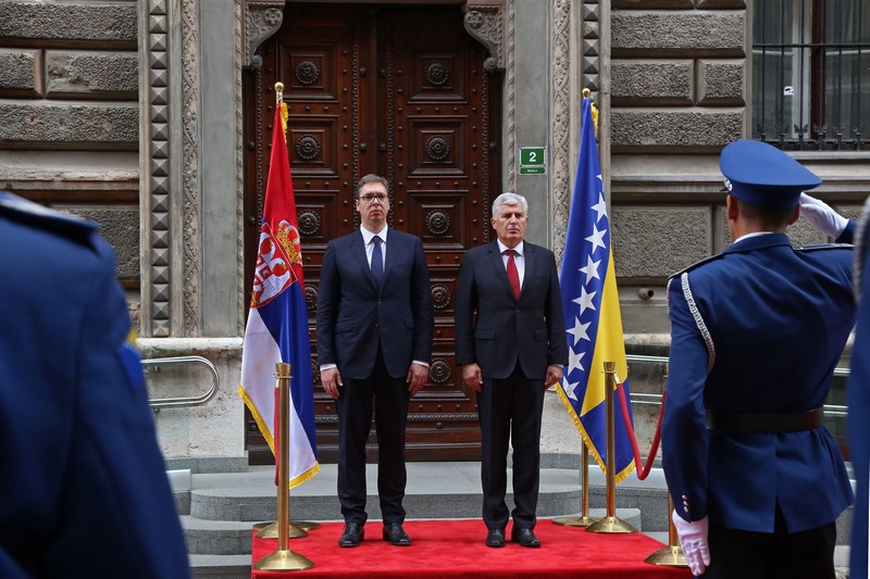 Hvala vam lijepo. Uvažene dame i gospodo, dragi prijatelji, meni je izuzetna čast da danas možemo u Bosni i Hercegovini ovdje u našem Predsjedništvu pozdraviti predsjednika Republike Srbije gospodina Vučića, osobito što to činimo nakon punih šest i više godina. Imali smo izuzetno konstruktivne razgovore i vjerujem da će se atmosfera i duh ovog dvodnevnog posjeta predsjednika i njegovog izaslanstva nastaviti u jednoj ovakvoj dinamici, s mnoštvom tema koje već dugo opterećuju odnose u Bosni i Hercegovini, na našem prostoru i šire, koje možemo zajednički rješavati da posluže kao primjer i za druge probleme koje Bosna i Hercegovina ima sa svojim susjedima. Razgovarali smo, naravno o našoj gospodarskoj suradnji, o uvođenju vanjske politike koju možemo zajedno raditi i oko objekata koje smo do nedavno zajedno dijelili, ali jednako tako i da se zajednički podržavamo u institucijama koje znače nešto kada su u pitanju međunarodni odnosi za Republiku Srbiju, odnosno Bosnu i Hercegovinu. Na isti način smo razgovarali i o problemima koje imamo kada je u pitanju rješenje pitanja granice između Bosne i Hercegovine i Republike Srbije, naglašavajući koliko je to bitno za Bosnu i Hercegovinu, obzirom da smo mi riješili pitanje granice između Bosne i Hercegovine i Crne Gore. Uvjeren sam da ovim pristupom, kako smo danas imali, primarno od nas iz Bosne i Hercegovine, a uz ohrabrenje predsjednika Republike Srbije, možemo vrlo brzo doći do zajedničkih rješenja kroz rad povjerenstava koja trebaju tu pomoći kako bi poslali jednu snažnu poruku svima nama u Bosni i Hercegovini da se okrenemo budućnosti, da što manje budemo opterećeni prošlošću. Naravno, razgovarali smo i o drugim temama koje su do sada bile teme, kako povezati kvalitetnom prometnicom Sarajevo i Beograd, jednom autocestom i, naravno, sve što je u energetskom sektoru nama bitno jer mislimo da se trebamo mnogo kvalitetnije povezati kada su u pitanju prometna i energetska infrastruktura. Jednostavno, vjerujem da je ovo danas početak jednog potpuno novog odnosa u suradnji između Predsjedništva Bosne i Hercegovine i predsjednika Srbije. Nama je to jedno veliko ohrabrenje da pokušamo zbiti redove i veliku krizu koju imamo na političkoj razini u Bosni i Hercegovini, možda i ovim dolaskom izaći nekako iz nje. S te strane dobili smo snažno ohrabrenje. Vjerujem da ćemo upravo sa Srbijom kao zemljom partnerom na gospodarskom sajmu, na proljeće u Mostaru, također napraviti jednu potpuno novu poruku u toj suradnji, jer Srbija je i danas jedan od najznačajnijih trgovinskih partnera Bosne i Hercegovine. Želimo to na još jednoj većoj razini uraditi i na taj način. Tu je i ono o čemu se govorilo ovih dana, određeni zajednički projekti koje želimo pomoći, misleći konkretno, kada sam ja u pitanju, odnosno i druga dva člana Predsjedništva, da ona pomoć koja dolazi ide ka pravoslavnoj crkvi u Mostaru i tom projektu koji već dugo traži obnovu. Mnoštvo je tema koje bi nas trebale ohrabriti, pa je moguće da će vrlo brzo na poziv predsjednika Srbije tri člana Predsjedništva biti u uzvratnom posjetu Beogradu, odnosno u Srbiji. Još jednom, veselim se da sam danas mogao zajedno s kolegama biti domaćin predsjedniku Republike Srbije. Nadam se da će ovi današnji naši razgovori i poruke koje smo poslali sutra biti potvrđene od nositelja naše izvršne i zakonodavne vlasti u BiH i da dolazi jedno potpuno novo vrijeme okrenuto budućnosti između naše dvije zemlje. Hvala vam lijepo.