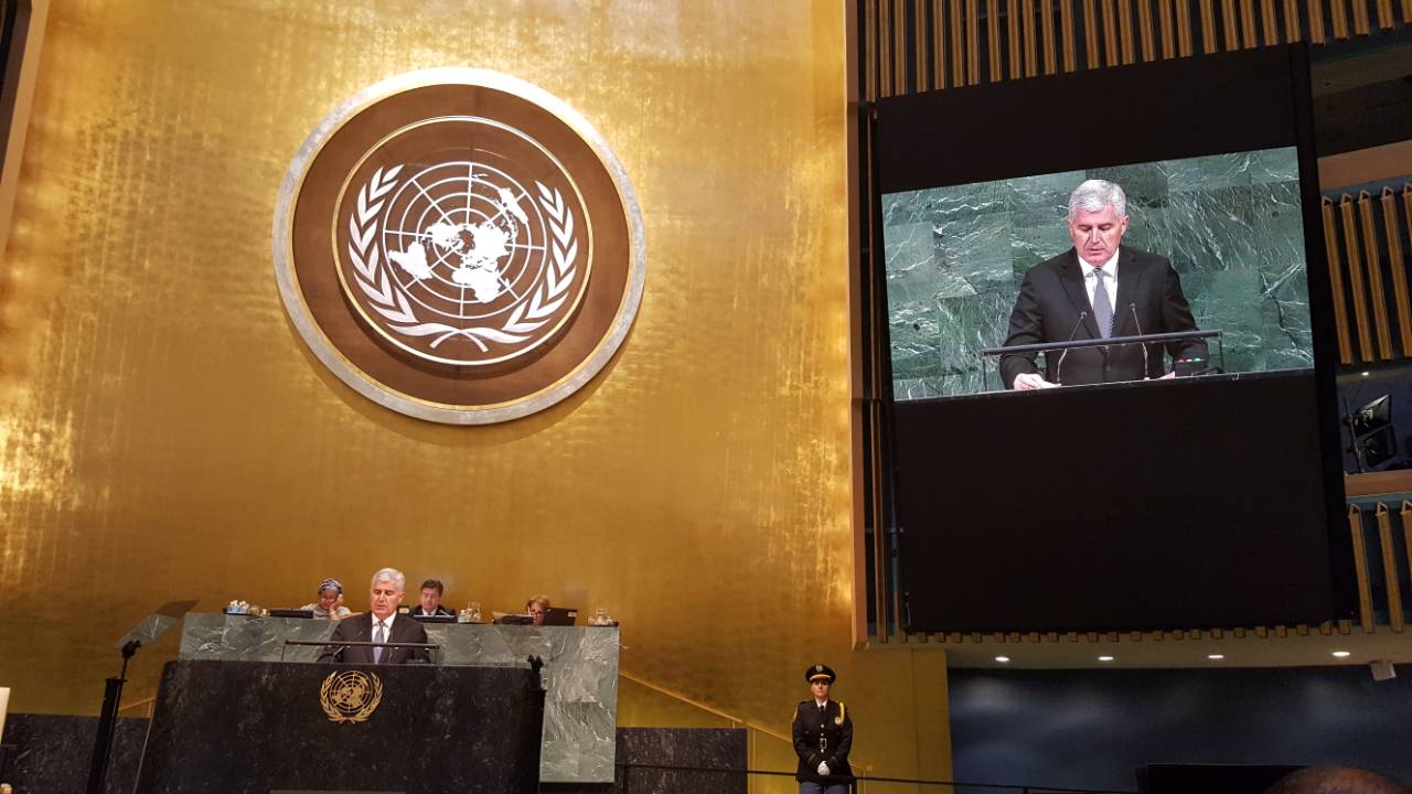 Gospodine Predsjedniče, Gospodine Generalni tajniče, Ekselencije, Poštovani izaslanici, Dame i gospodo, Poštovani gospodine Predsjedniče Opće skupštine, gospodine Lajčak, Dozvolite mi, prije svega, da vam čestitam na mandatu koji ste upravo započeli kao predsjednik 72. zasjedanja. Uvjeren sam da će takt i diplomatska vještina u koje smo se u Bosni i Hercegovini imali prigode izravno uvjeriti pomoći da najvažnije tijelo Ujedinjenih naroda napravi nove pomake i učinkovito se suoči sa novim izazovima. Moja zahvalnost ide i odlazećem predsjedniku, za liderstvo koje je pokazao tokom prethodnog (71.) zasjedanja. Pridružit ću se čestitkama upućenim Nj. E. Antoniu Guterresu na izboru za generalnog tajnika Ujedinjenih naroda. Njegova, i plemenita, i mudra namjera, da se u godinama koje su pred nama više pozornosti posveti izgradnji mostova koji nas međusobno spajaju svakako će, u Bosni i Hercegovini, imati najveću moguću potporu. U svijetu u kojem dominiraju neizvjesnost i nesigurnost, jednostvano nije moguće preuveličati važnost principa i multilateralnog okvira koji su za nas osmislili utemeljitelji Ujedinjenih naroda. Snaga ove Organizacije je i naša pojedinačna i zajednička snaga ukoliko želimo iskorijeniti bolest, glad, terorizam i svaki vid prijetnje ljudskom postojanju. Pri tome, naravno, ne možemo a ne priznati sebi samima koliko je potrebno i od kolikog je značaja, kroz ozbiljne i konstruktivne mjere, približiti UN sustav njegovom kaotičnom okruženju i adaptirati ga na način da predviđa izazove koji iz njega dolaze i na njih odgovara snagom čija jačina daleko prelazi prostu sumu naših pojedinačnih snaga. I dalje, sa nesmanjenom zabrinutošću, gledamo na nastavak stradanja sirijskog naroda. Bosna i Herecegovina najoštrije osuđuje svaki vid nasilja nad civilnim stanovništvom. Nasilje mora prestati. Svakom sirijskom djetetu, ženi i čovjeku, i svakom od sirijskih izbjeglica, potrebno je vratiti dostojanstvo ljudskog bića kao i vjeru u mogućnost oporavaka i novih životnih šansi. Mi ćemo, kao i drugi danas na ovom mjestu, nastaviti pozivati na mirno i političko rješenje, kroz pregovore, u procesu nad kojim vlasništvo može imati samo sirijski narod, na temelju Ženevskog komunikea i uz pomoć međunarodne zajednice i Ujedinjenih naroda, predvođene posebnim izaslanikom za Siriju, čije nesebične napore da se nastave pregovori u Ženevi izuzetno cijenimo. Gospodine Predsjedniče, Čini se uistinu nepotrebnim ponavljati kako ne može biti mira i blagostanja za izraelski narod ako isto nije osigurano i za palestinski, i obrnuto. Izraelsko-palestinski sukob predstavlja najveću neriješenu nevolju Bliskog istoka i trenutačno pomanjkanje ikakvih pregovora između strana je uznemirujuće. Oba naroda zaslužuju bolje. Opet, već decenijama, putovanje prema miru odvija se presporo i postaje sve složenije. Stoga je potrebno glasno se podsjetiti šta je krajnji cilj, a to je postojanje dvije države, izraelske i palestinske, koje će mirno živjeti jedna do druge, u sigurnosti i priznatim granicama. Bosna i Hercegovina ostaje privržena stajalištu kako je ostvarenje takvog cilja moguće postići ispunjenjem obaveza strana, na temelju relevantnih rezolucija Vijeća sigurnosti Ujedinjenih naroda, Madridskih principa i Arapske mirovne inicijative. Kroz ljudsku povijest, zlo je uvijek egzistiralo, nekada na rubu naših zajednica, nekada u manjoj ili većoj mjeri unutar njih, ne uvijek u istom obliku i ne uvijek istog inteziteta. Terorizam je, nesumljivo, najveće zlo današnjeg trenutka, u oblicima i jačini da predstavlja najveću prijetnju međunarodnom miru i sigurnosti. Destruktivne sile uvijek imaju duboke korijene i mnogo različitih lica ali niti jedno opravdanje za njihovo postojanje. Da pobijedimo terorizam i zauvijek otklonimo strah terora iz naših zajednica, uz multidimenzionalni i integrirani pristup, potrebni su nam zajednički i koncentrirani napori. Bosna i Hercegovina će nastaviti davati svoj doprinos punoj impelementaciji Globalne strategije Ujedinjenih naroda za borbu protiv terorizma kao i aktivnostima Komiteta za borbu protiv terorizma. Posebno pozdravljamo napore koje u jačanju anti-terorističkih kapaciteta Ujedinjenih naroda poduzima generalni tajnik Antonio Guterres i, u tom smislu, utemeljenje novog Ureda za borbu terorizma (Office of Counter-Terrorism). Sa svoje strane smo spremni kontinuirano jačati suradnju na regionalnim, sub-regionalnoj i međunarodnoj razini, posebno u područjima prikupljanja i razmjene informacija. Kao članica Globalne koalicije za borbu protiv ISIL-a/Da’esh-a, nastavit ćemo pomagati napore Koalicije da se čitave ljudske zajednice oslobode i oporave od patnji i štete koju sa sobom nosi ISIL/Da’esh i njegova globalna mreža. Bosna i Hercegovina zalaže se za punu implementaciju svih rezolucija Vijeća sigurnosti koje za cilj imaju da se osobe koje sudjeluju u finansiranju, planiranju, pripremi ili izvršenju terorističkih djela dovedu pred lice pravde. Nadalje, u cjelosti dijelimo mišljenje da je za dugoročno iskorjenjivanje zla terorizma i nasilnog ekstremizma potrebno neprestano ulagati napore u čitav spektar međusobno povezanih oblasti, od eliminacije nepravde i nejednakosti, siromaštva i nesloboda do unapređenja razumijevanja među različitim i drugačijima, jačanja međukulturnog dijaloga i općeprihvaćenih demokratskih vrijednosti. I onda kad pomislimo da smo u svim područjima uradili dovoljno, potrebno je krenuti ispočetka i udvostručiti trud! Svijet u kojem nema prijetnji za uništenjem čovječanstva manja je Utopija što je manje sredstava kojima se uništenje može provesti. Stoga su razoružanje i ne-proliferacija oružja za masovno uništenje i dalje preduvjet za globalni mir i sigurnost kojem svi težimo. U tom kontekstu, Bosna i Hercegovina se pridružuje strogoj osudi nuklearnih testiranja koje je provela Narodna Demokratska Republika Koreja. Također, poziv