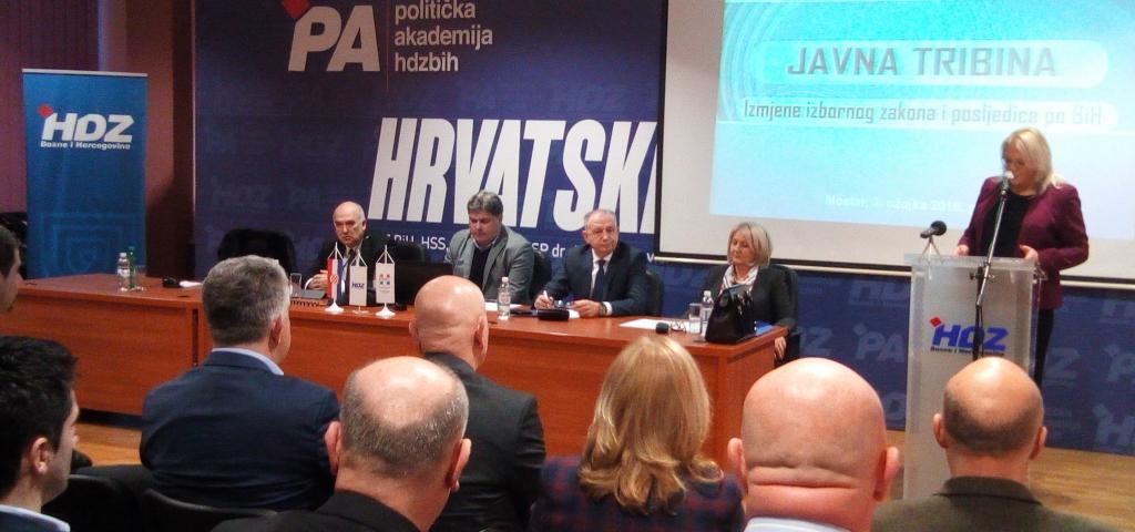 Javna tribina "Izmjene izbornog zakona i posljedice po BiH" održana je sinoć u središnjici HDZ-a BiH u Mostaru, a predavači su bili Borjana Krišto, zamjenica predsjednika HDZ-a BiH i predsjedateljica Zastupničkog doma PS BiH, Bariša Čolak, zamijenik predsjedatelja Doma naroda PS BiH, Josip Merdžo, glavni HNS-a i Goran Kraljević sa Sveučilišta u Mostaru.