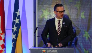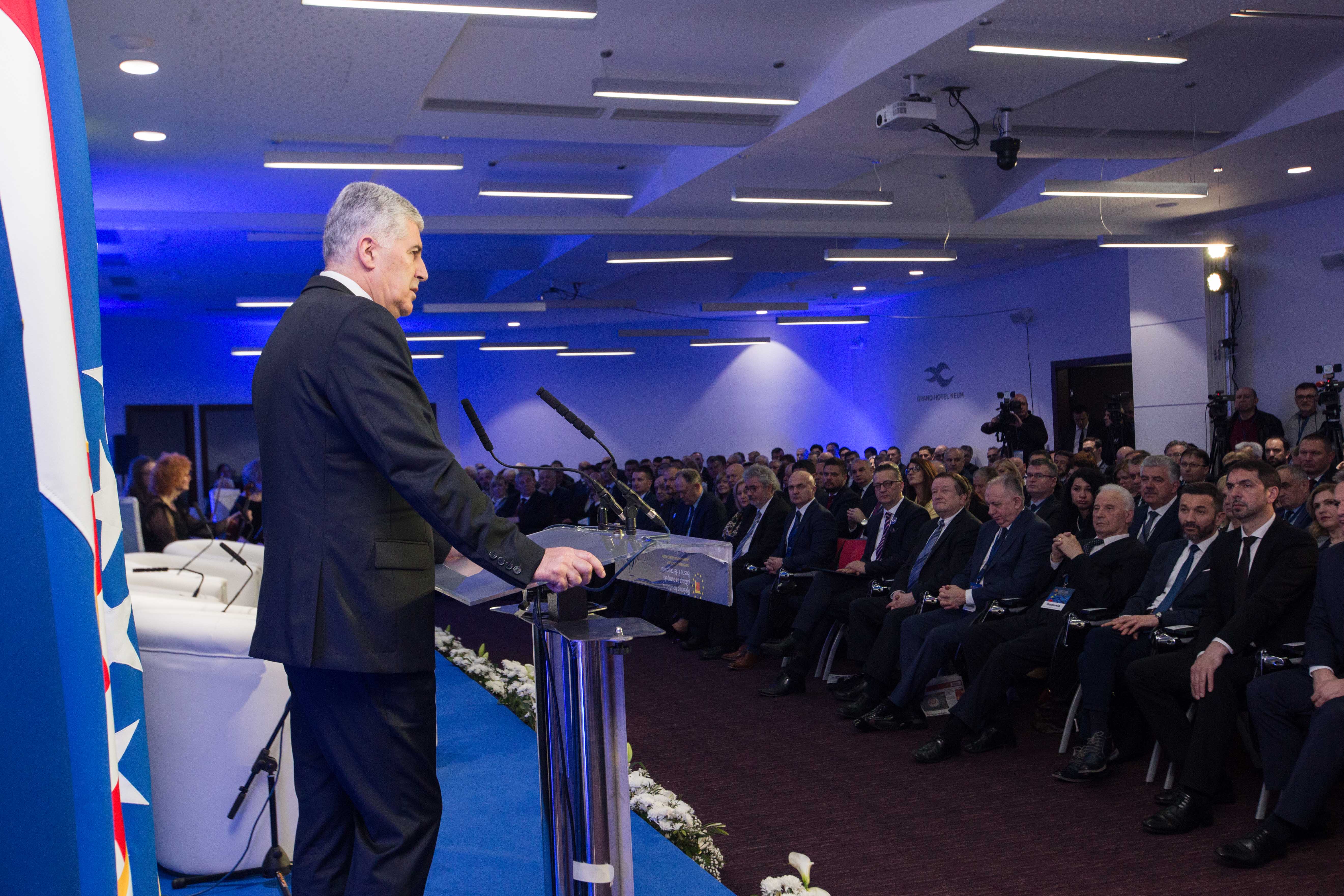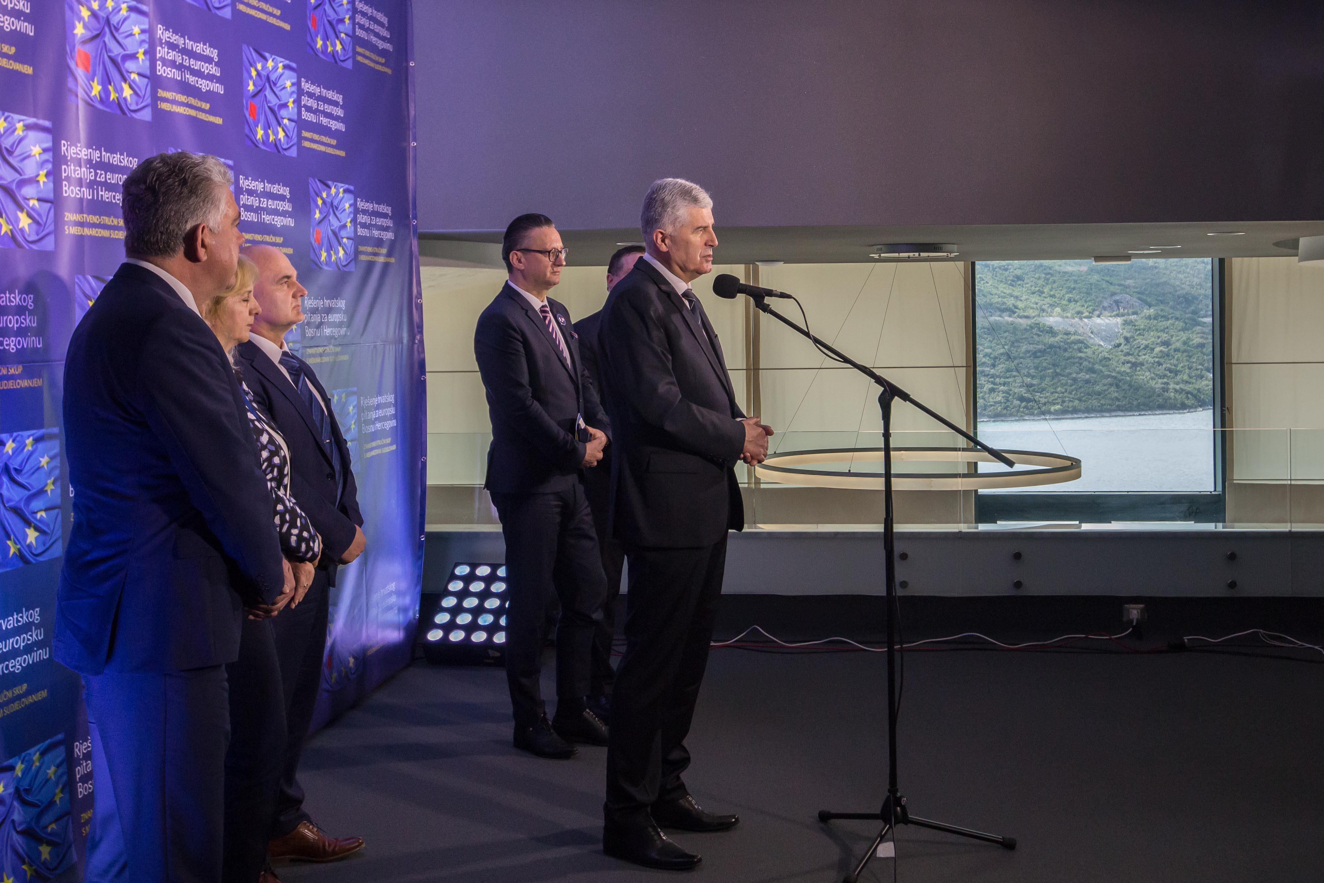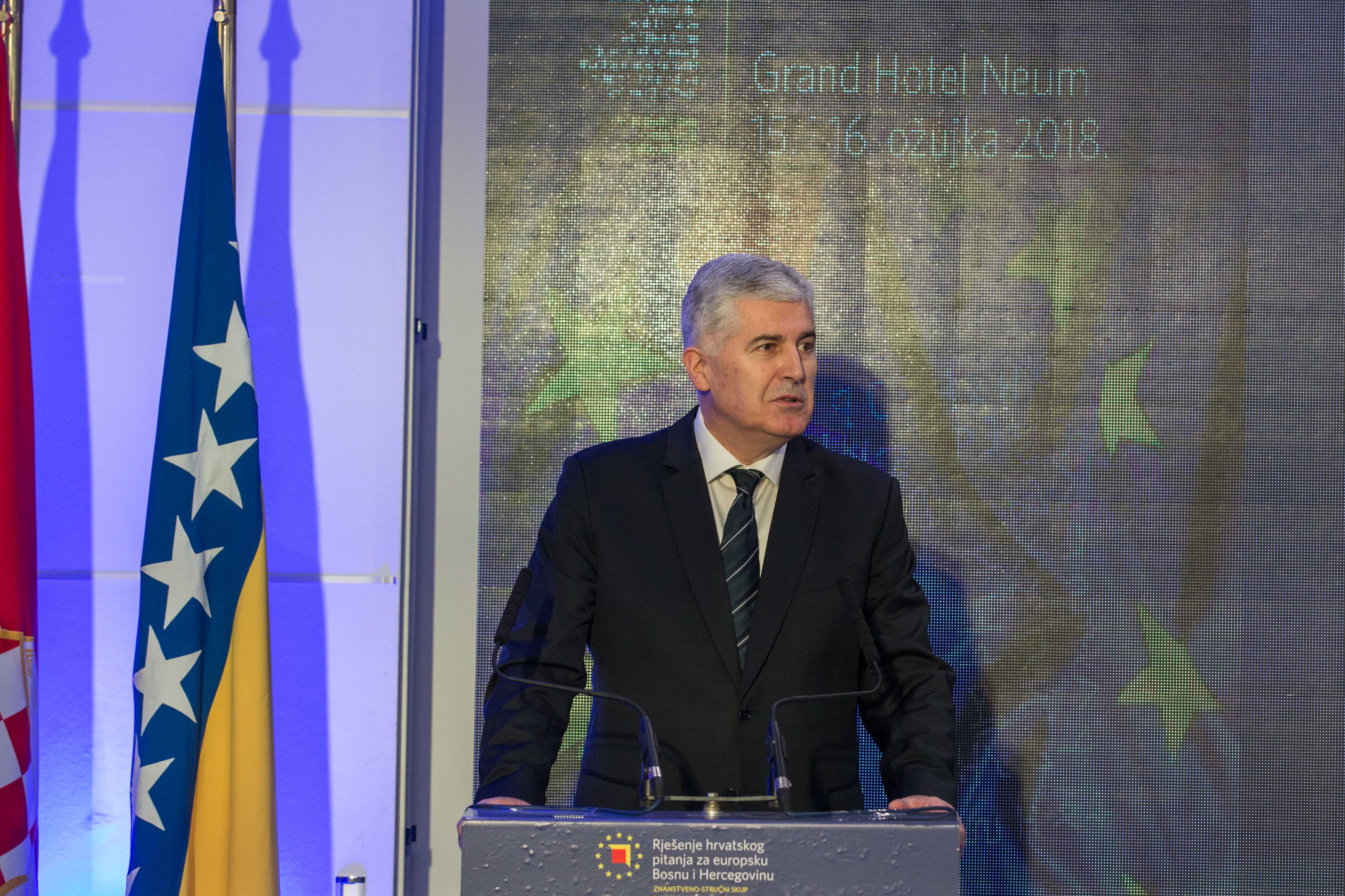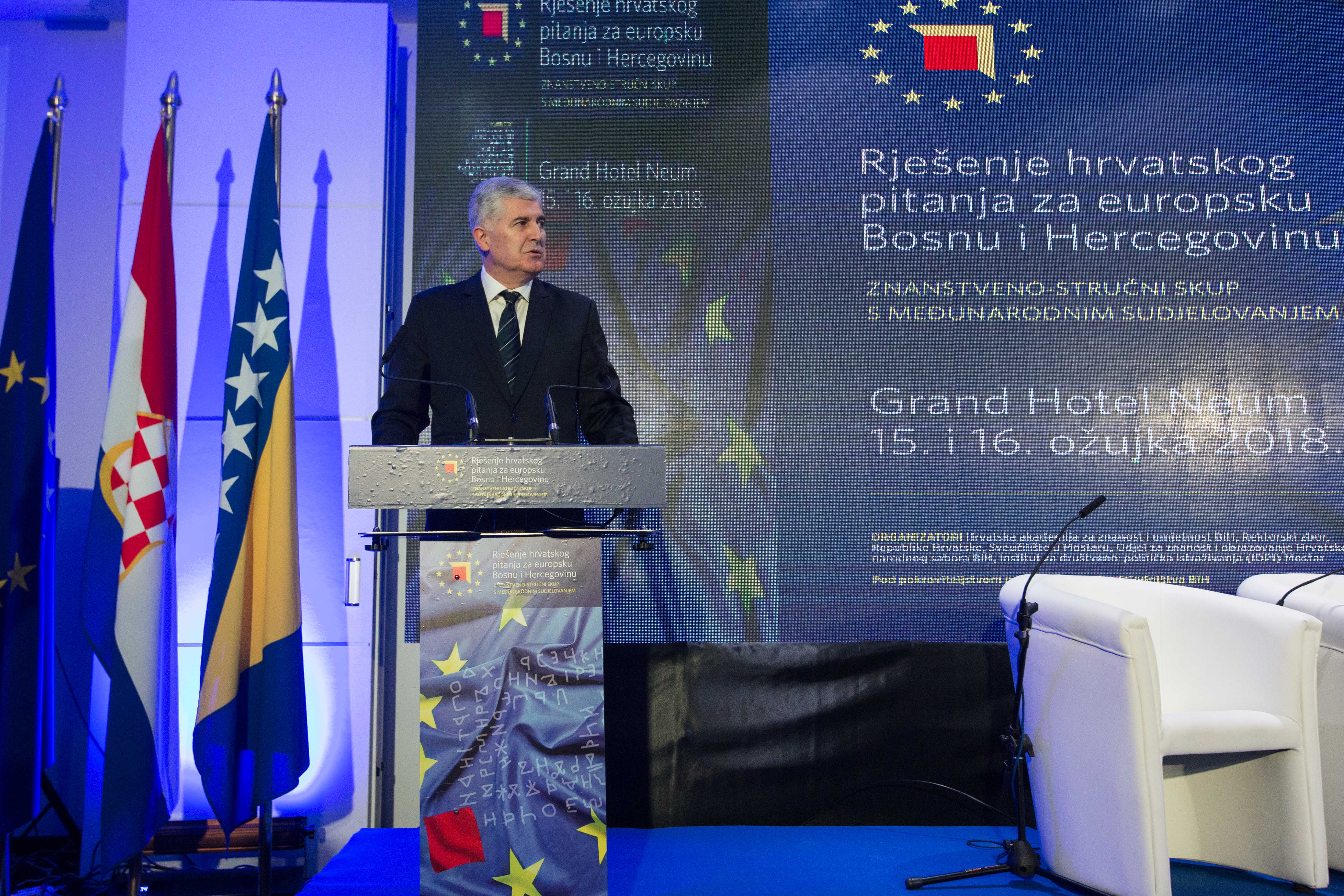 Predsjedatelj Predsjedništva BiH akademik Dragan Čović je u pozdravnom obraćanju izrazio nadu da će ovaj znanstveno-stručni skup i svi sudionici skupa dati doprinos za ostvarenje mnogih otvorenih pitanja za hrvatski narod. Kazao je da hrvatsko pitanje ne postoji, nego pitanje BiH, države s ravnopravnim konstitutivnim narodima. „Nakon prošle godine dobili smo odluku Ustavnog suda BiH koja jasno i nedvosmisleno govori o tri konstitutivna naroda i njihovoj ustavnoj poziciji. Odluka jasno govori šta je to Federacija BiH, ne federacija kantona, već federacija konstitutivnih naroda. Vjerujem da smo mi na vješt način ponudili rješenje i za hrvatski narod i za Bosnu i Hercegovinu", kazao je predsjedatelj Čović. Naglasio je da je BiH nezaustavljiva na svom europskom putu te izrazio nadu da će zaključci ove konferencije doprinijeti da BiH bude moderna država u kojoj hrvatski narod mora biti ravnopravan s ostalim.