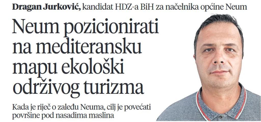 Razvijati turističke kapacitete Neuma, ali uz poštivanje svih ekoloških normi i standarda, a paralelno s tim ulagati u razvoj mediteranskih kultura poput maslina u samom zaleđu - put je za daljnji napredak ove jedine primorske bosanskohercegovačke općine koja ima ogromne potencijale, ističe u intervjuu za Večernji list Dragan Jurković, kandidat HDZ-a BiH za načelnika općine Neum. Ova lokalna sredina po mnogočemu je specifična; pored položaja uz Jadransko more tek se posljednjih godina intenzivirao proces njezina povezivanja s ostatkom države, a Jurković u svemu vidi veliku priliku za unaprjeđenje kako turizma tako i poljoprivredne proizvodnje, u cilju održivog razvoja mjesnih zajednica u zaleđu Neuma. Sve zajedno, a uz aktivan rad općinske administracije, put je i za povratak mladih obrazovanih kadrova koji upravo u svojem rodnom mjestu mogu imati dobre preduvjete za graditi budućnost.