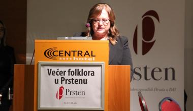 „Udruge, poput Udruge Hrvata BiH Prsten, jesu udruge koje stoje na braniku hrvatskog identiteta. Koje promiču kulturu, jezik, običaje, tradiciju, gospodarsku suradnju, a kako bi očuvali temeljne vrijednosti i jedinstvo hrvatskog naroda. I baš kako i stoji u Statutu Prstena, bez okupljanja nema sjećanja, bez potpore nema čvrstog oslonca, bez kulturnih i povijesnih vrijednosti nema bića hrvatskoga, a bez svih ovih načela nema demokratske političke kulture“, kazala je ministrica Gudeljević.