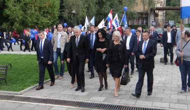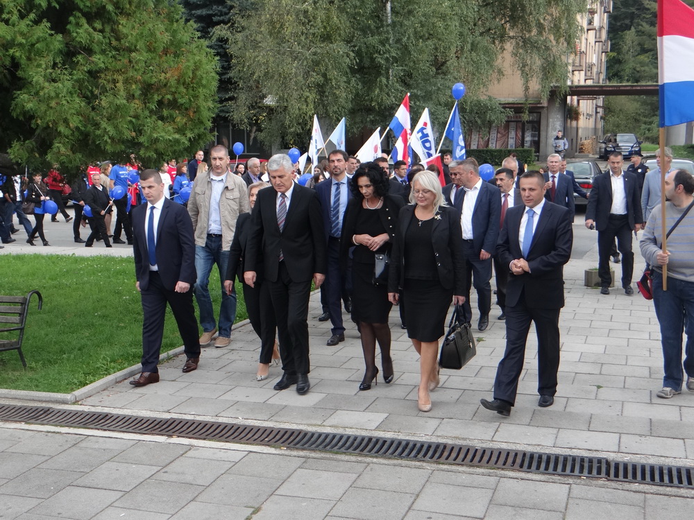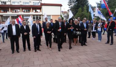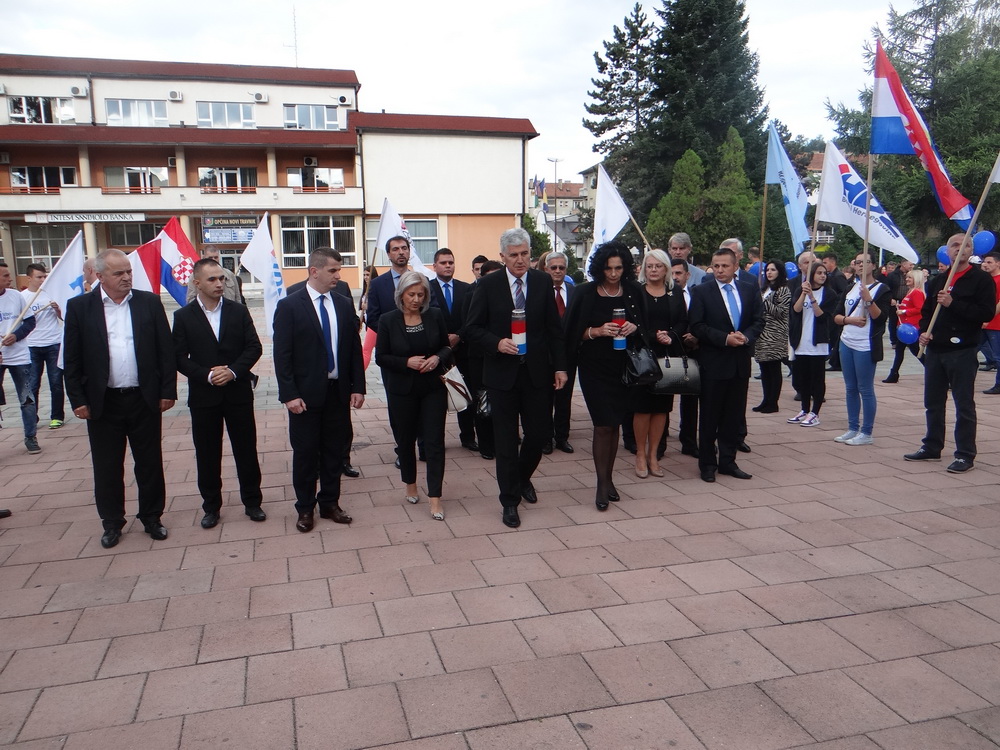 Prije početka Središnjeg predizbornog skupa, Visoko izaslanstvo položilo je vijenac i zapalilo svijeće na spomen oblježju poginulim hrvatskim braniteljima ispred zgrade Općine Novi Travnik.