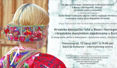 Udruga za očuvanje i promicanje hrvatske tradicijske kulture u Bosni i Hercegovini ”Stećak” i Hrvatska matica iseljenika iz Zagreba, u okviru održavanja Osme revija tradicijske odjeće i izbor najljepše Hrvatice izvan Republike Hrvatske, sinoć je u Tomislavgradu svečano otvorena multimedijalna izložba “Hrvatsko djevojačko ruho u Bosni i Hercegovini i hrvatskim manjinskim zajednicama u Europi“.