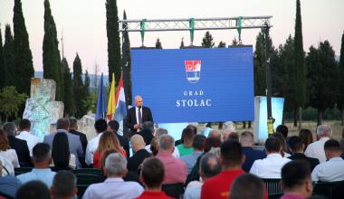 „U Stocu se uvijek osjećam lijepo i ugodno, ali me ovo povijesno mjesto, Radimlja, uvijek iznova ispuni jednom posebnom energijom, jednim posebno lijepim osjećajem ponosa i pripadnosti. Upravo u tom duhu, duhu pripadnosti i zajedništva, raduje me što sam počašćen pozivom da vam osobno čestitam Dan Grada Stoca, prvi otkako je Stolac službeno postao gradom, a jednako iskreno i blagdan zaštitnika stolačke župe, sv. Ilije Proroka“, kazao je dr. sc. Nevenko Herceg, predsjednik Vlade Hercegovačko-neretvanske županije, obraćajući se nazočnima na svečanom prijemu upriličenome sinoć na Radimlji u povodu Dana Grada Stoca i blagdana njegova zaštitnika sv. Ilije.