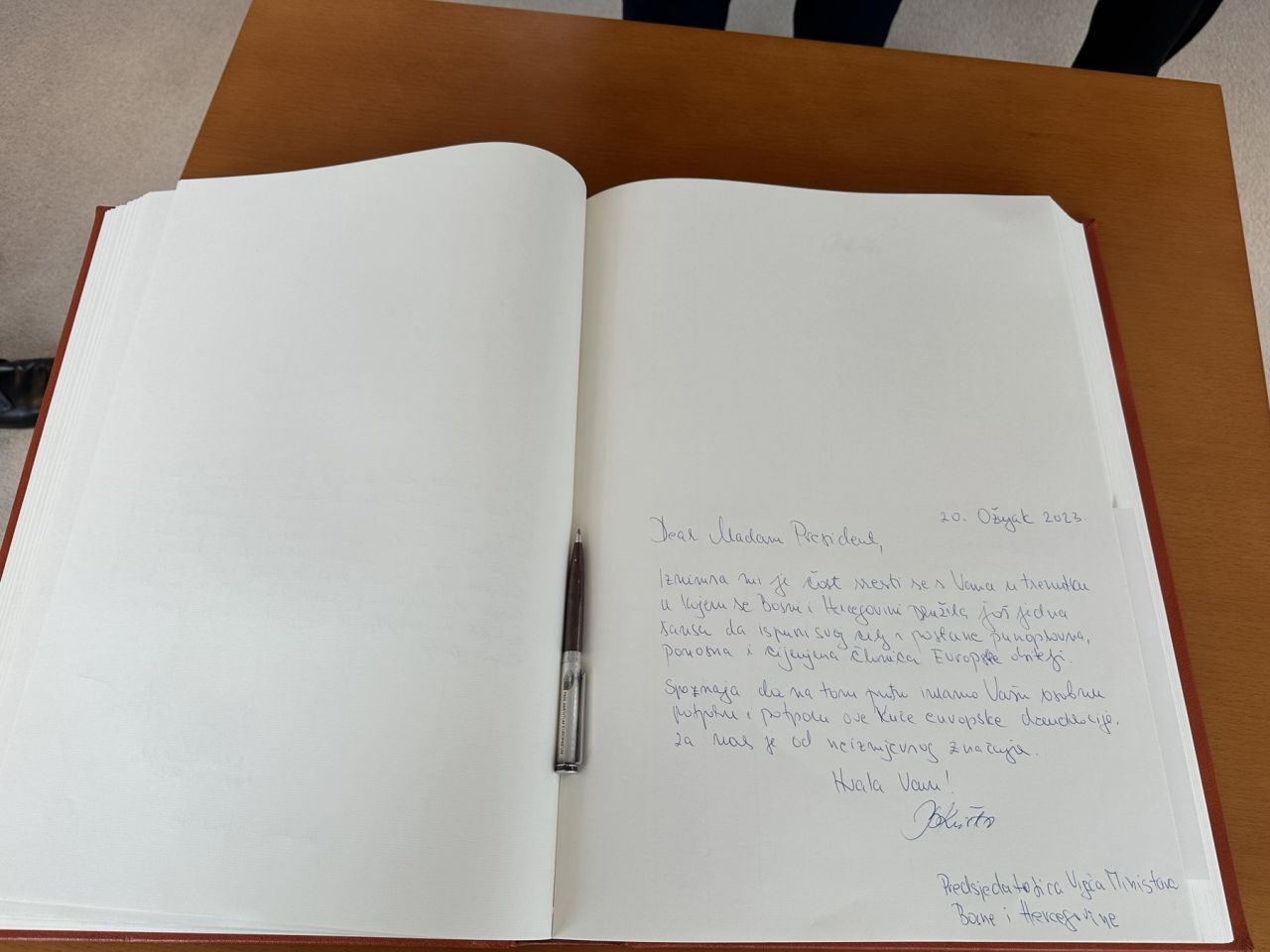 Naglasila je da postoji pozitivno radno ozračje i da je Vijeće ministara već usvojilo nekoliko bitnih dokumenata za EU integracije, te utvrdilo Nacrt proračuna za 2023. godinu, što će uveliko olakšati rad institucija BiH. Dodala je da su stabiliziranje političkih prilika i iskreni dijalog svih političkih aktera, uz poštivanje pune jednakopravnosti sva tri konstitutivna naroda i ostalih, ključ za ubrzanje reformskih i integracijskih procesa.