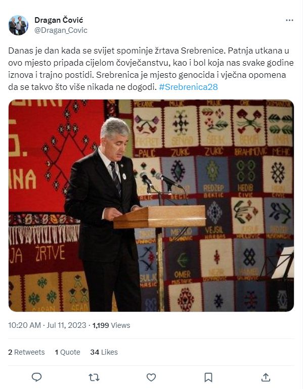 „Danas je dan kada se svijet spominje žrtava Srebrenice. Patnja utkana u ovo mjesto pripada cijelom čovječanstvu, kao i bol koja nas svake godine iznova i trajno postidi. Srebrenica je mjesto genocida i vječna opomena da se takvo što više nikada ne dogodi“, napisao je predsjednik Čović.