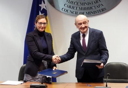Zamjenik predsjedatelja Vijeća ministara i ministar financija i riznice BiH Vjekoslav Bevanda i direktorica Ureda Europske banke za obnovu i razvoj (EBRD) u BiH Manuela Naessl potpisali su ugovor o grantu u vrijednosti tri milijuna eura za projekt...